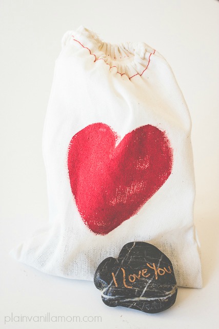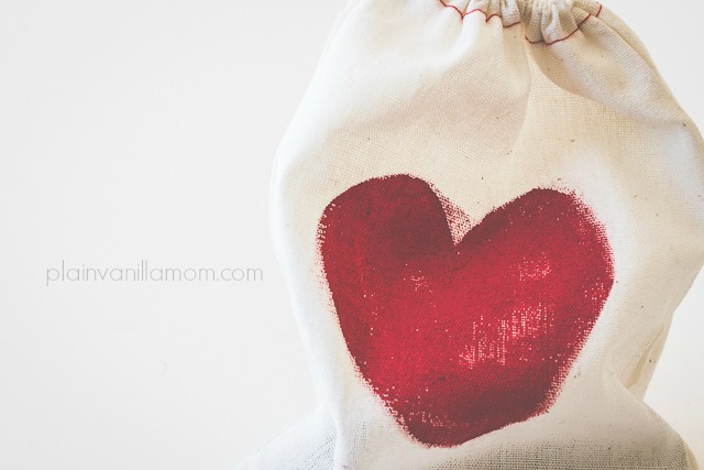 For the bag I used a cookie cutter to trace a heart shape and then painted it in red. To keep the paint from bleeding through, put a small piece of paper inside the bag while painting it.