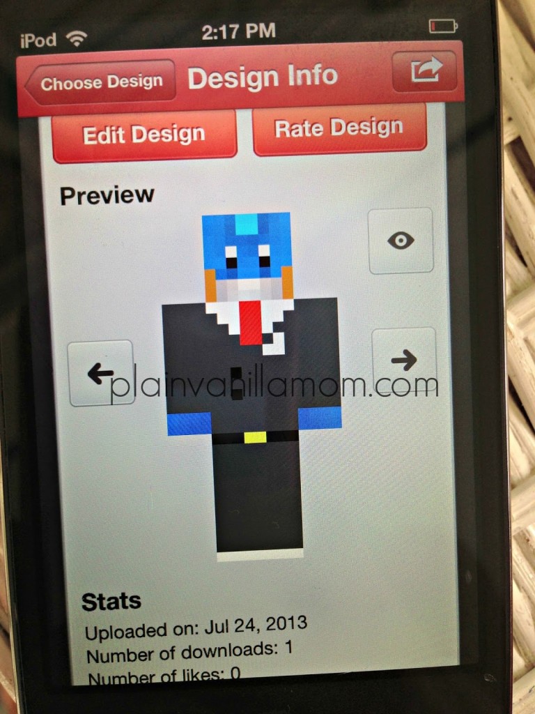 I won’t even begin to pretend I know who or what these characters are but A is loving this app! And really so am I. We had some good mother & son bonding time over crafting creepers. The app is a little pricier as far as apps go coming in at $3.99, but in his (and in my) opinion it has been totally worth it. He’s spend hours printing out characters, cutting, folding and pasting them together. He’s cleaned out an area of cubbies in his room to make Minecraft displays (yes I said cleaned). There are a couple of companion apps for it too like “Skin Studio” for example. Skin Studio comes in at $2.99 but it allows you to create “skins” (or as I call them outfits) for your minecraft characters.