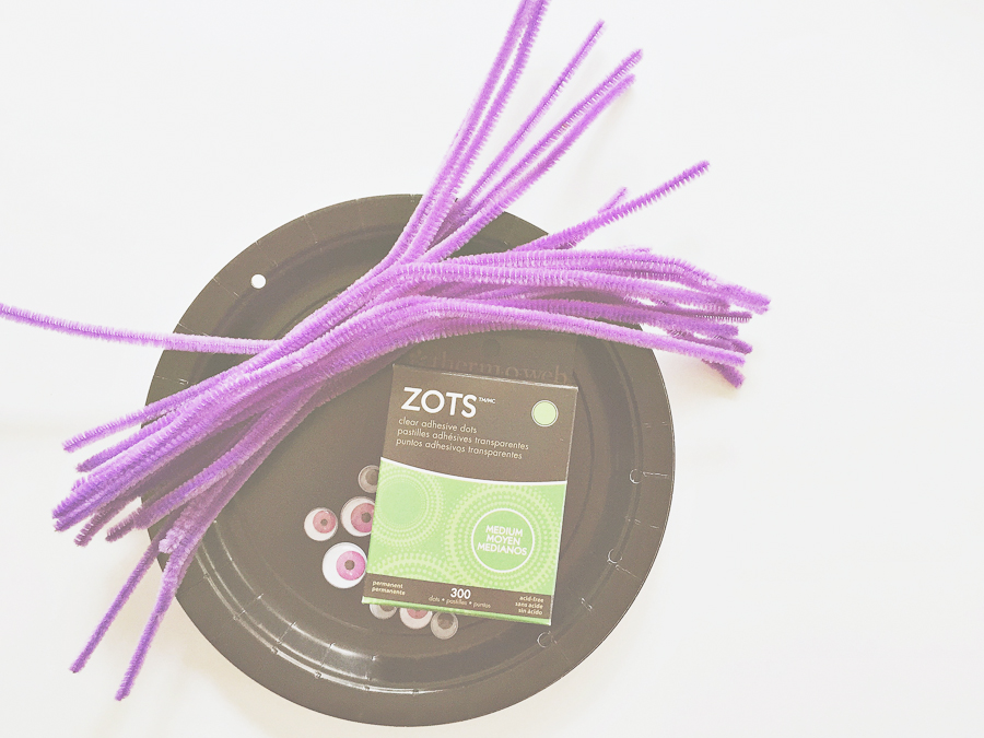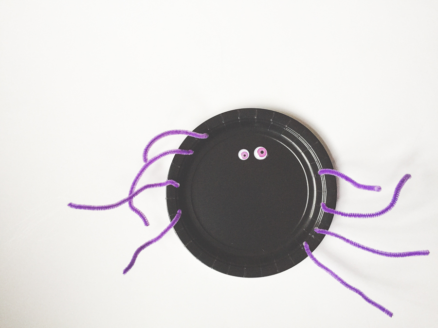 Here’s what you do.. Punch holes in the side of the plate for legs and then thread the pipe cleaners through the holes. Our first spider only had 6 legs (oops Mom!) and after C put the pipe cleaners through the holes I just tied big ol’ knots in the back so they couldn’t slip through. For our second spider I got smarter (and remembered a spider actually has 8 legs not 6) and showed C how to thread the pipe cleaner in one hole and out the other so one pipe cleaner became two legs if you catch my drift. Stick with me…that’s the hardest part here. After that all you need to do is glue on eyes and your done!