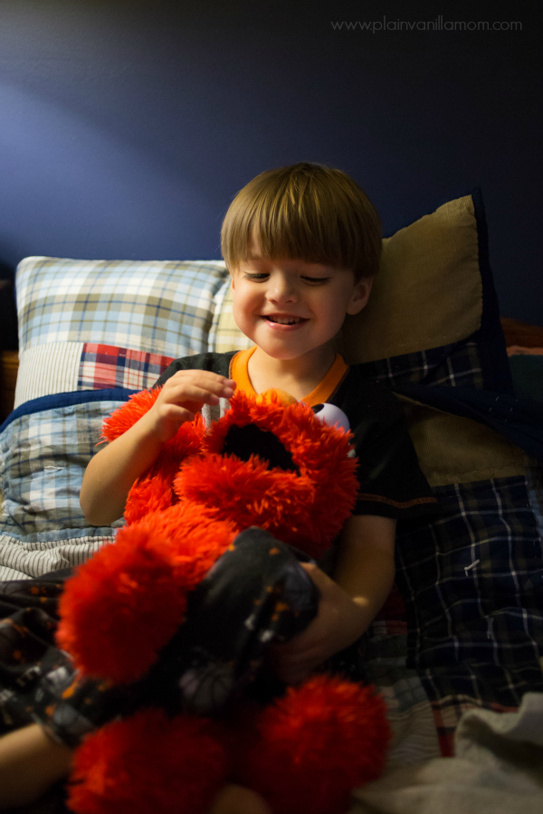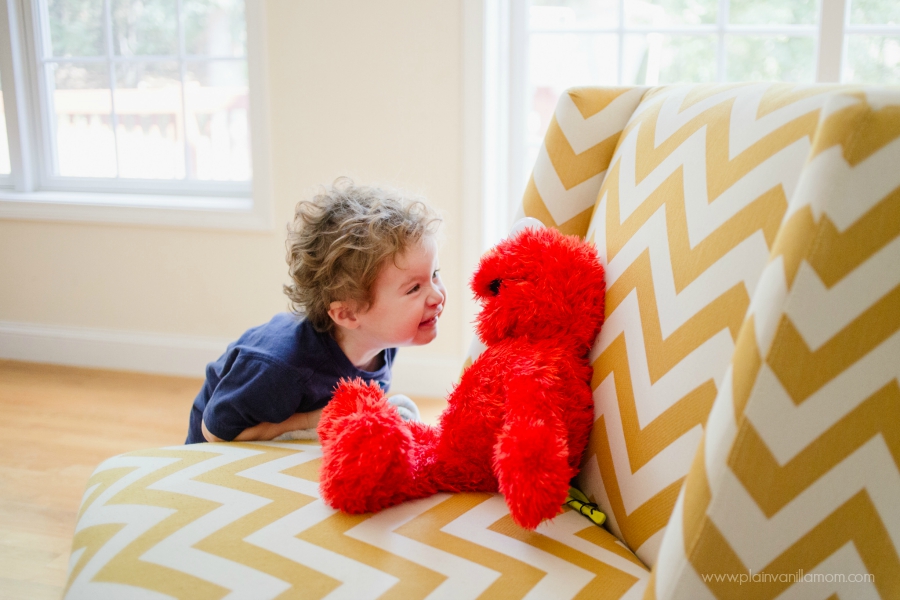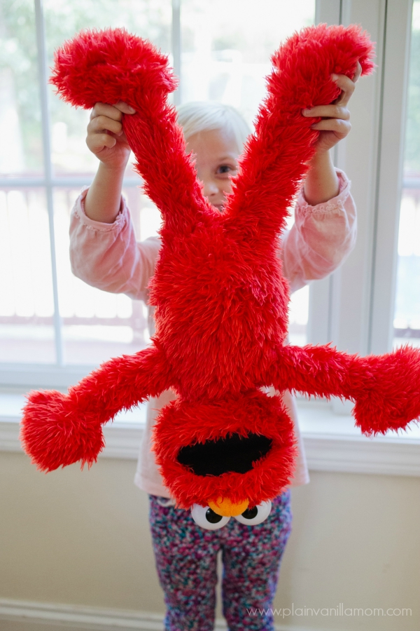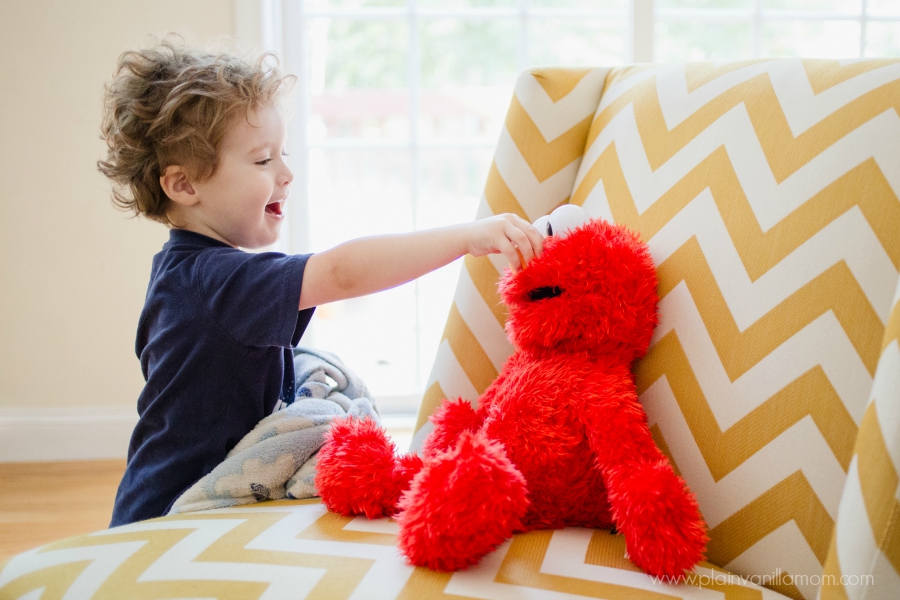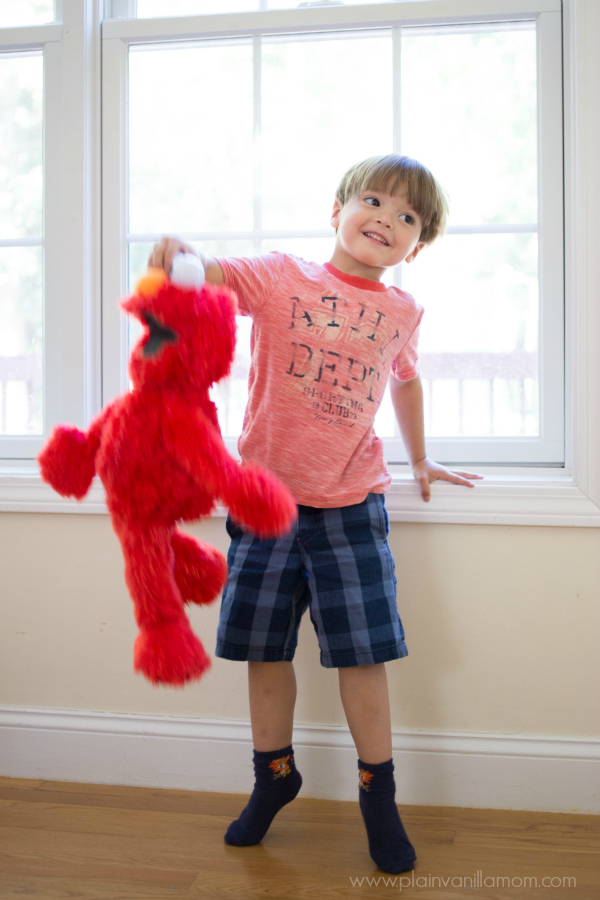 I think my 2 year old would be happy to squeeze Elmo’s nose all day! Sometimes Elmo makes a funny honking sound when you squeeze his nose and Little E just couldn’t get enough of it.