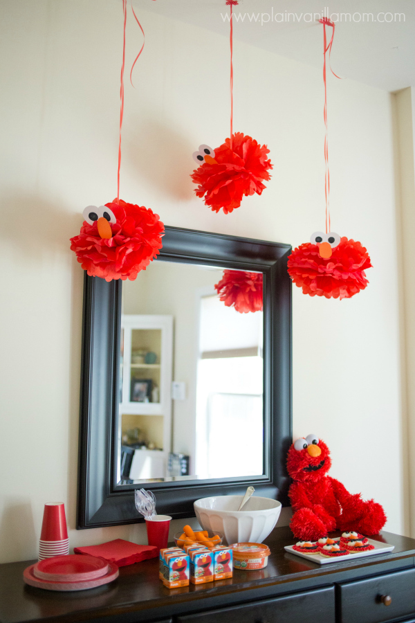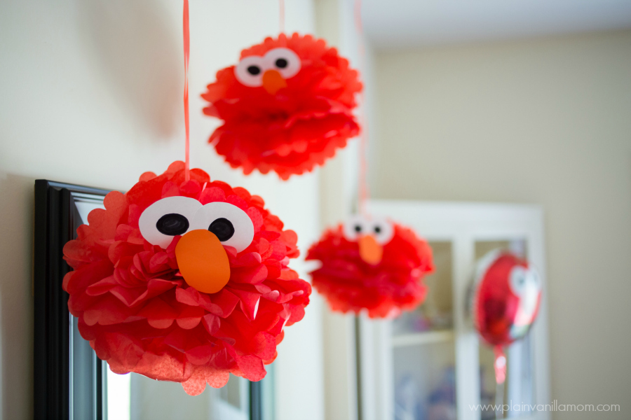 When it comes to Elmo red is key. I was able to pick up red plates & napkins at our local dollar store along with some Elmo mylar balloons. (We actually sent each guest home with an Elmo balloon along with their Playskool gifts). The most loved party decoration however had to be these hanging Elmo’s that I DIY’d out of tissue paper balls, also found at the dollar store.