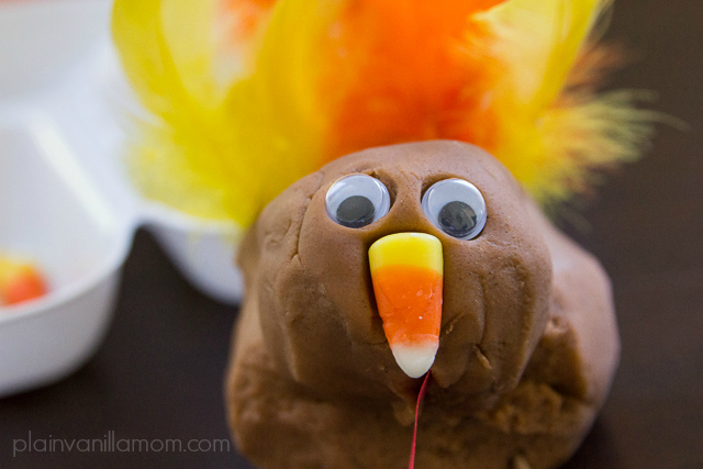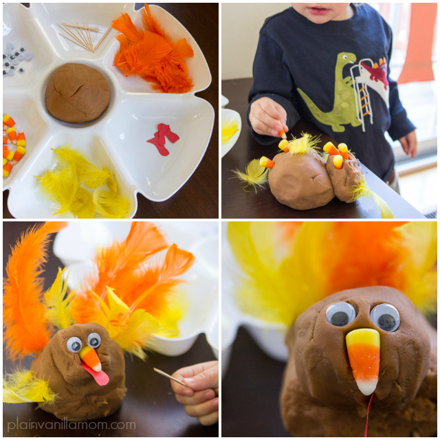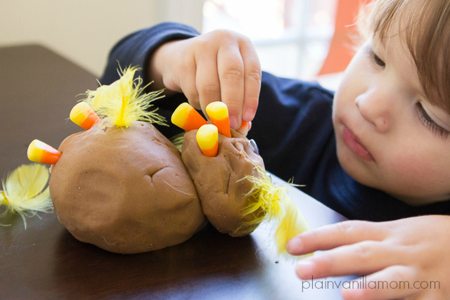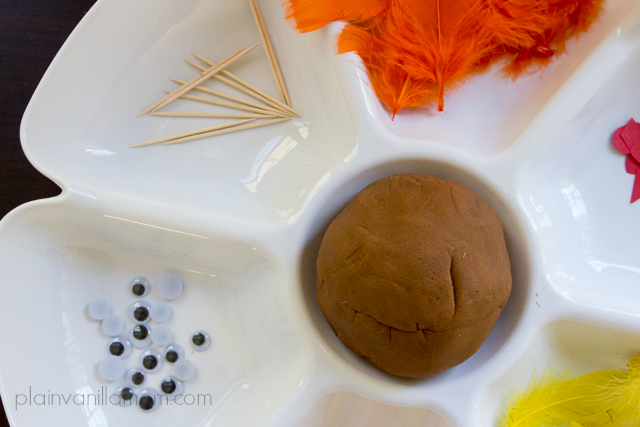 I am still desperately trying to get back on track after the hectic week we had last week and the time change this past weekend. Part of returning to ‘normal’ around here and returning to some reasonable semblance of a schedule means getting back to our afternoon invitations. Our most recent being this invitation to create play dough turkeys.