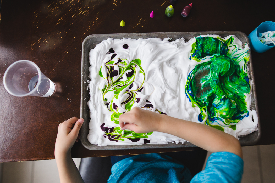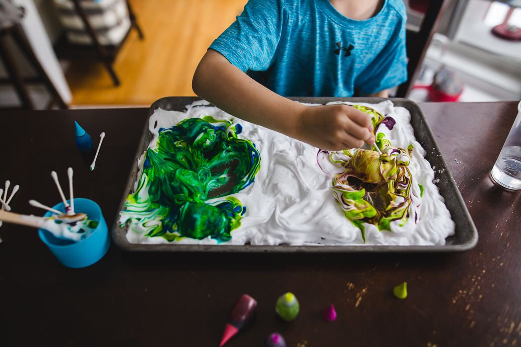We tried a new method of dying our Easter Eggs last weekend. Have you seen this? Easter eggs dyed using shaving cream & food coloring. I saw this video come across my Facebook feed the other day and instantly I knew we had to try it. Well let me tell you, it was fun! And yielded gorgeous results.