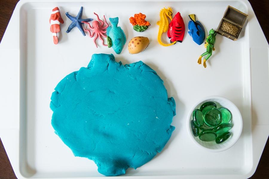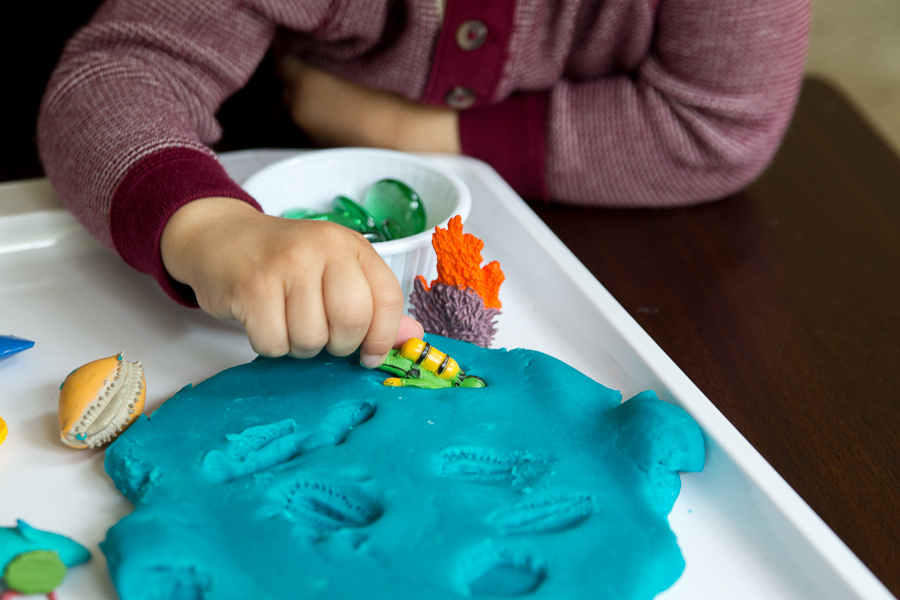 The blue jello play dough we made last week was just screaming to be played with in some sort of oceanic activity and these little Coral Reef Safari Toob figures that were the most recent to grace our collection were the perfect accompaniment. As a side note: My kids are addicted to these little figures right now. Even Little E (15 months) enjoys playing with, inspecting and handling them). Giving him just the figures in a small basket to explore is a sensory experience in and of itself. A little more on the sensory aspect later though. For this activity, I laid everything out for C as you see here: