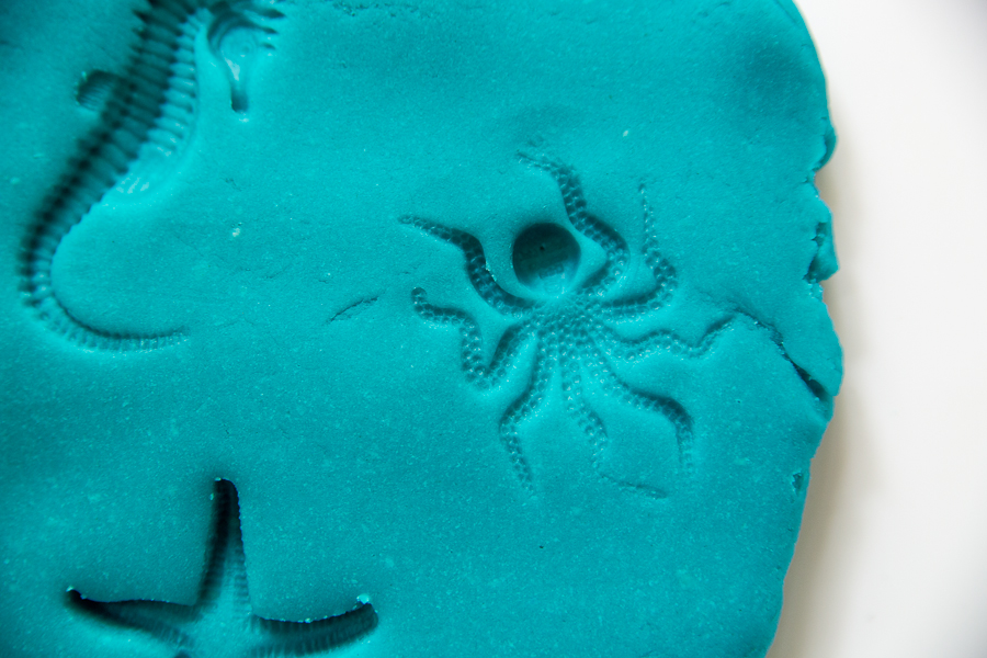 My (now almost 3yr old) Mr. C was so taken with making imprints and star shapes in the play dough from our red white & blue play dough last week that I thought I would capitalize on his interests for a few more activities. One of which turned out to be this Sea Life Play Dough Imprints invitation to play.