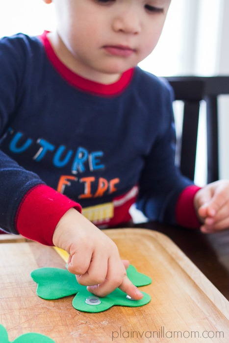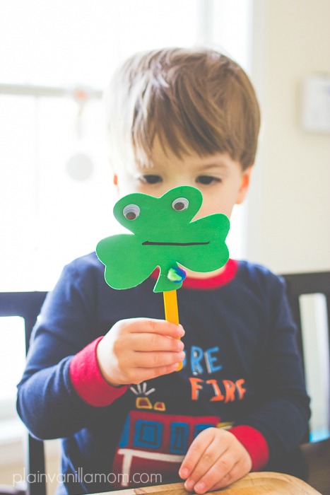 To make your shamrock puppet, use the glue dots to glue your craft stick to your foam shamrock. Add goggly eyes & pompoms to make the face and draw on a mouth with black marker. The way I use glue dots with C is I adhere the glue dots to the materials for him ahead of time and then let him stick them on. It’s almost like using stickers. It didn’t take him more than 5 -10 minutes to complete his puppets but he really enjoyed the process. In this case it didn’t bother me either that it was a quick activity because it didn’t take long to prep. Don’t you hate it when you spend a half hour prepping for an activity that lasts five minutes? I know I do!