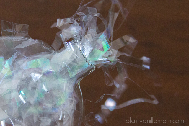 First we stuffed the ornaments with shred. Tip: use a pencil or other long object to help poke all the loose ends of the shred down inside the ornament. Any strands that were impossible to get stuffed in there I either just pulled out or snipped off with scissors.