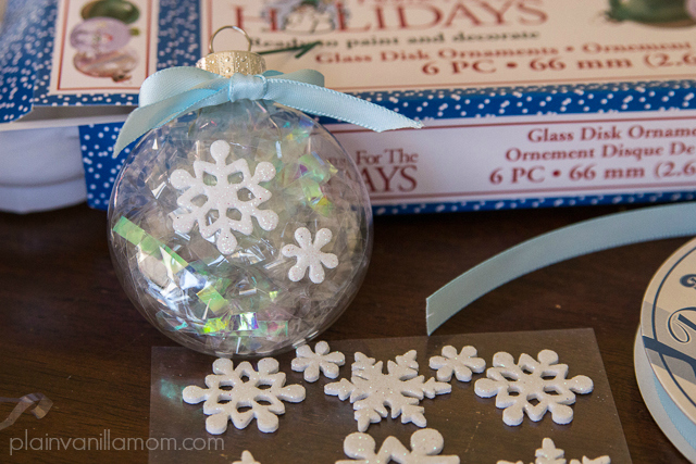 The first person that came to mind was our neighbor. You know, the neighbor who always greets you with a smile. The one who feeds your kids and thinks to put your trash cans out if you are away. Yes, that neighbor. We have been blessed to have a neighbor just like that. Well our neighbor has gone above and beyond this year. She came over in the middle of the night when I went into labor with Little E, and most recently took care of our cats and checked on our house daily while we were on vacation. I thought this was the perfect way to say ‘Thank You’ and let her know that her acts of kindness don’t go unnoticed. Here’s how we made our Snowflake Ornaments. They are super easy to make, and completely doable for Mr. A (9yrs old). He can pretty much make them himself from start to finish. You will Need