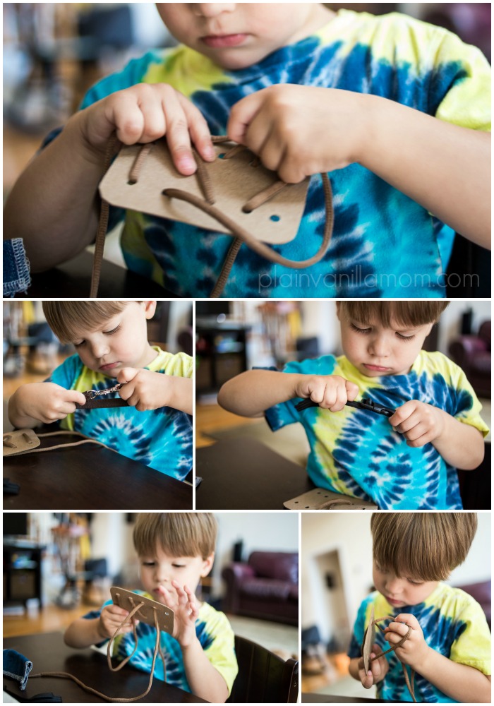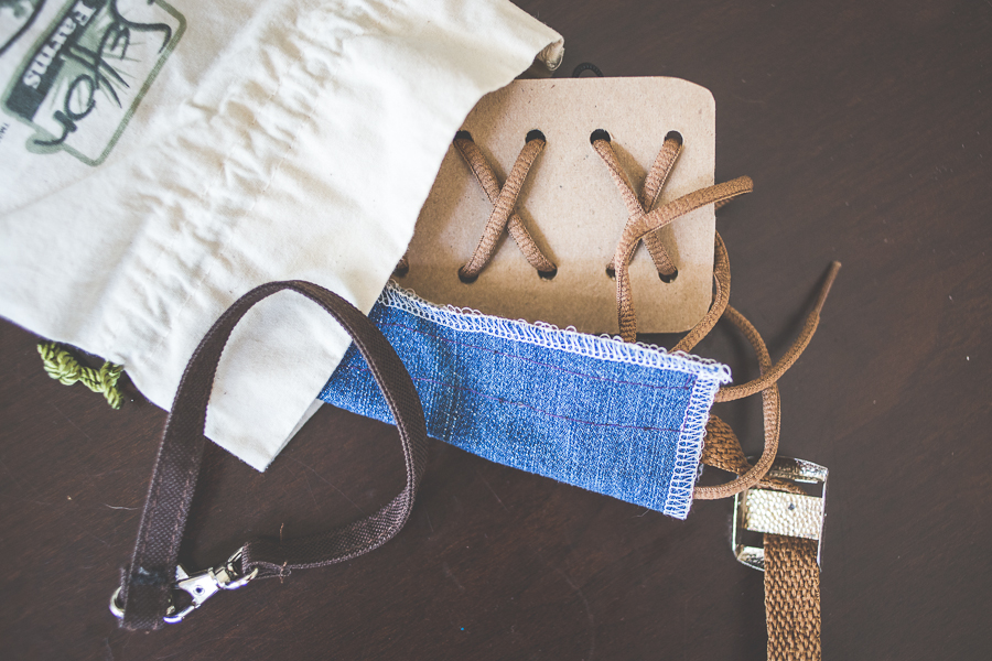 The activity that came along with the book was a big hit too. A bag filled with all kinds of goodies to practice those hands on skills (like tying your shoe) that every child needs to learn. Included were all sorts of things like velcro, a lacing card, zipper, buttons, snaps, buckles and more. C actually likes to buckle, zip, clip etc so this was fantastic for him. What a great idea and a fun way to practice! I’m sure he will get lots of enjoyment out of this little activity bag for many months to come. I might even toss it, along with the book, into our car for summer road trips. It’s bound to keep those little hands busy for awhile.