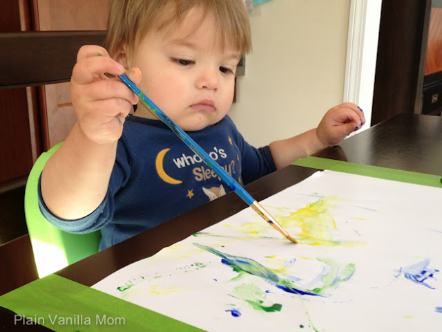 Painting. He’s still kinda trying to get the hang of this and he’s not big on getting paint on his hands, but with every exposure he gets a little more into it. As you can see our little artist takes his work very seriously…