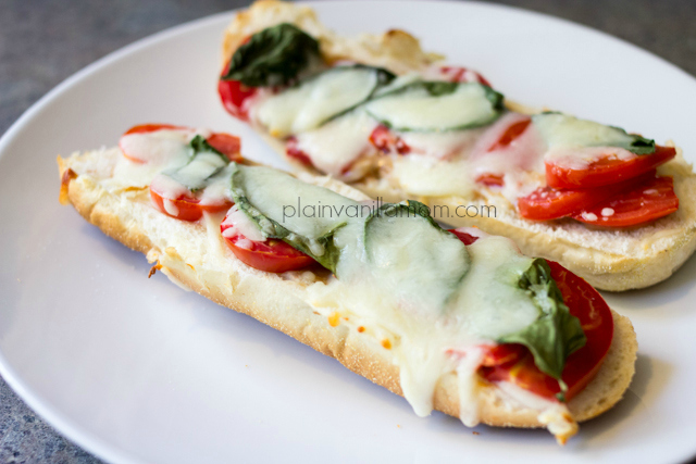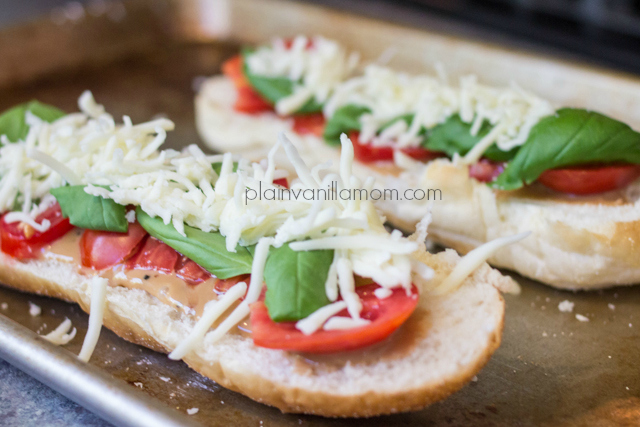 Not bad right? Yup it’s as good as it looks. Inspired by the bruschetta the hubs and I often make I grabbed some left over sub rolls (from a previous dinner of meatball subs) along with some shredded mozzarella, a little fresh basil, and some creamy balsamic vinaigrette.