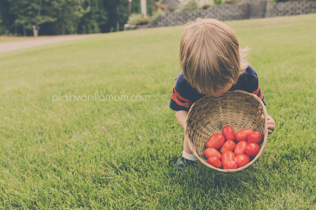 This year, with two under two in the house I opted out. Mother nature had other plans. Some of our tomatoes reseeded themselves along with a few herbs. My wonderful hubby took it upon himself to tend to the gardens with Mister C. C loved taking care of the tomatoes all summer and was beyond excited when they were finally ripe enough to pick. (Mind you the child won’t eat his tomatoes but I digress…)
